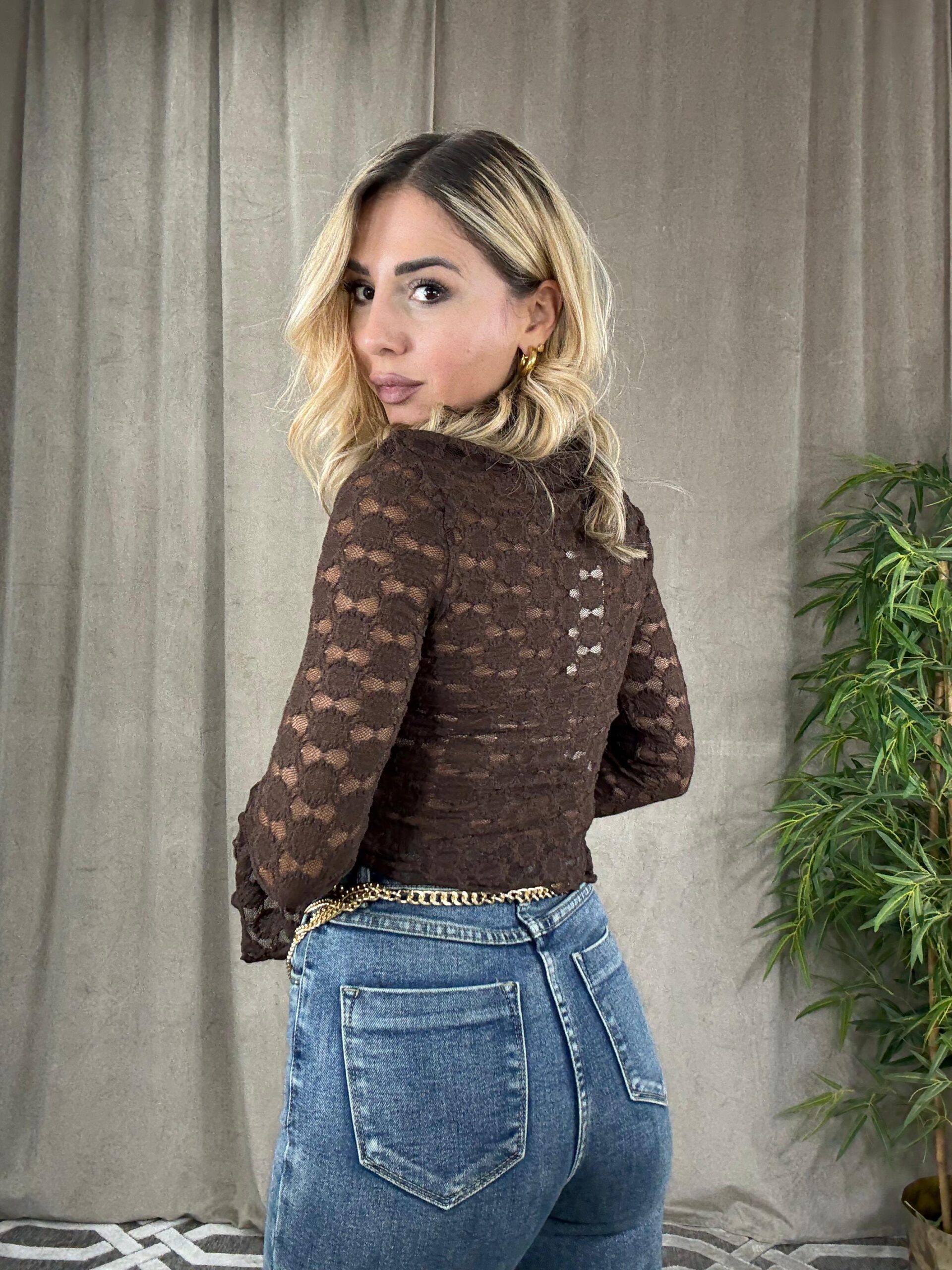 Maglia Kate In Pizzo Marrone Maniche Rouches
