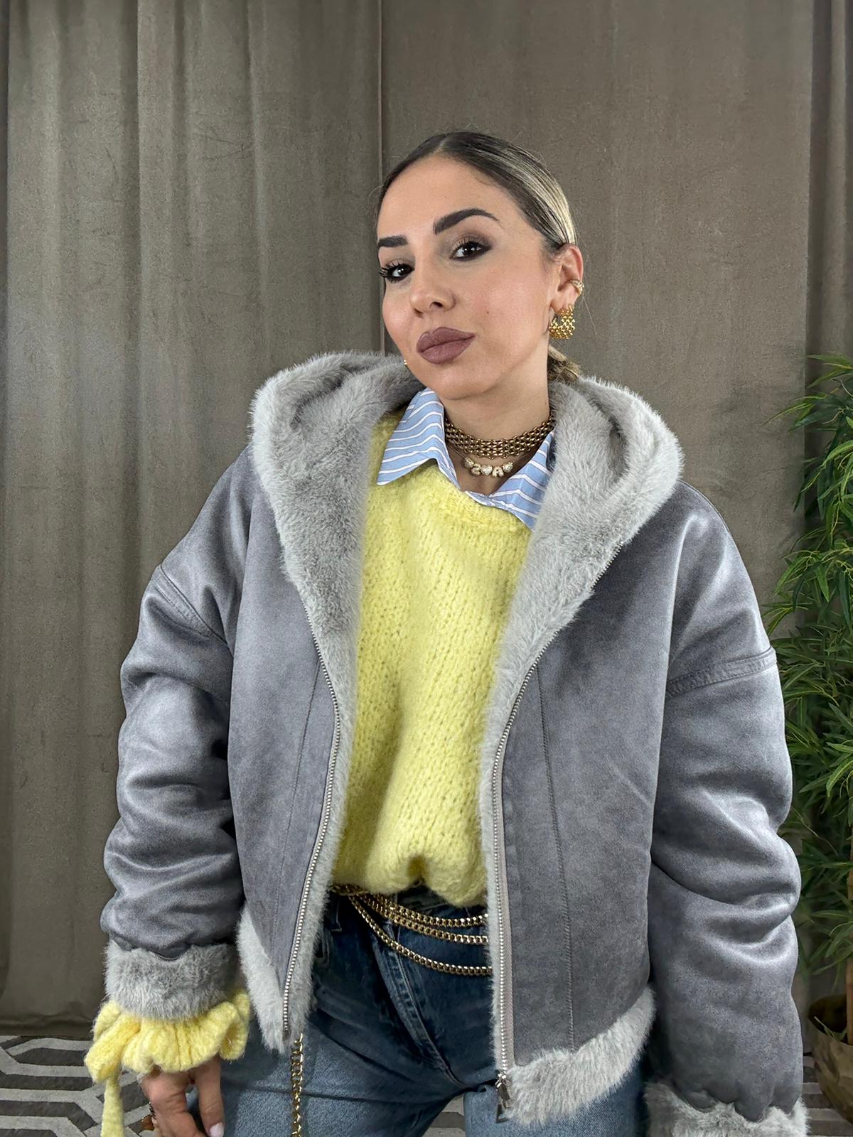 • Montone Double Face Siria Con Cappuccio Grigio
